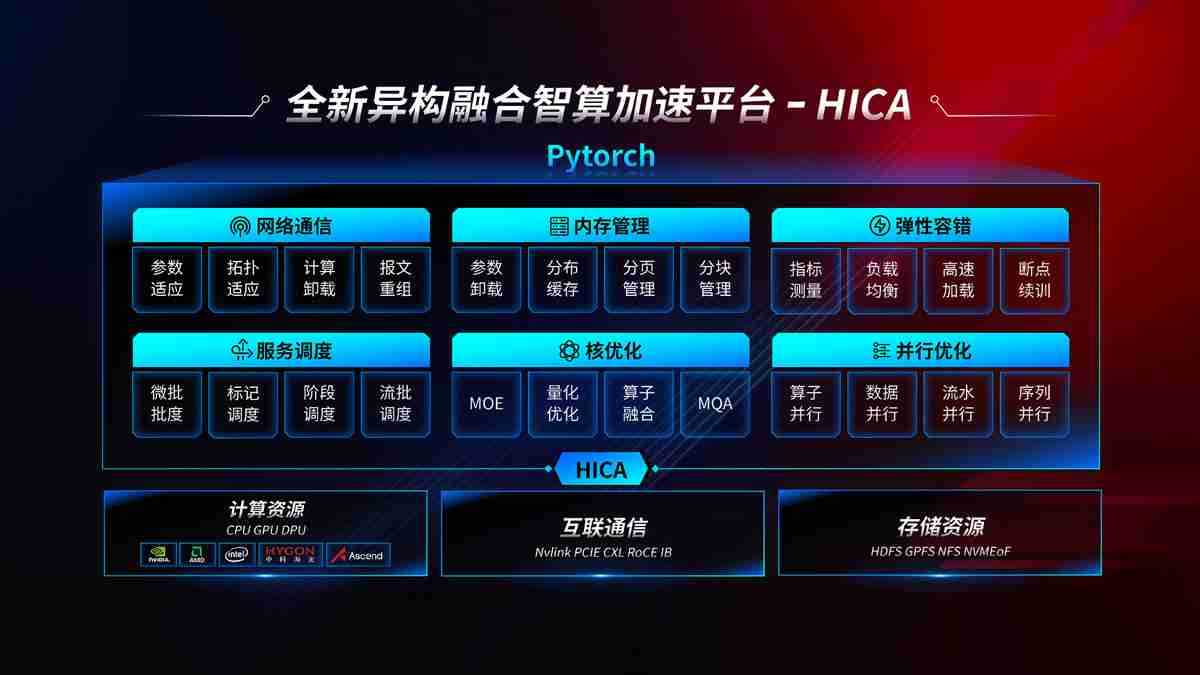 通过自研的服务层、、、、中间适配层、、、以及调度编排算法,,,采用数据并行、、、模型并行等多种并行方式,,把并行计算任务进行有效的分解,,,使其分别由相应的软件栈和算力资源来承接。。。当GPU资源变化,,HICA可以实时动态调度计算子任务并调整模型拓扑和架构,,,以充分聚合各种算力资源。。