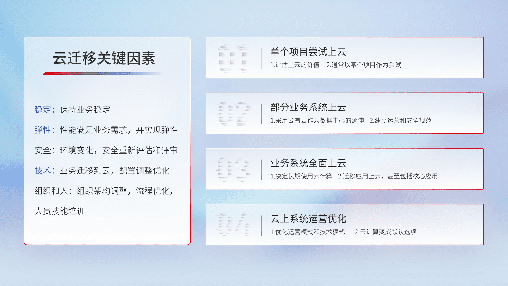 结合实际业务,,,从规划设计、、、、云平台选型、、、云原生改造、、、、数据迁移、、、、集成交付,,,迁移全过程为客户识别最佳上云路径,,,,做好风险识别管理,,设计网络架构、、、、身份权限、、、安全审计合规、、操作审计、、、、日志审计、、监控告警策略、、多站点容灾设计等,,对云上基础设施进行整体规划,,提升IT治理水平,,以满足弹性、、、、高可用、、、高性能的需求。。。