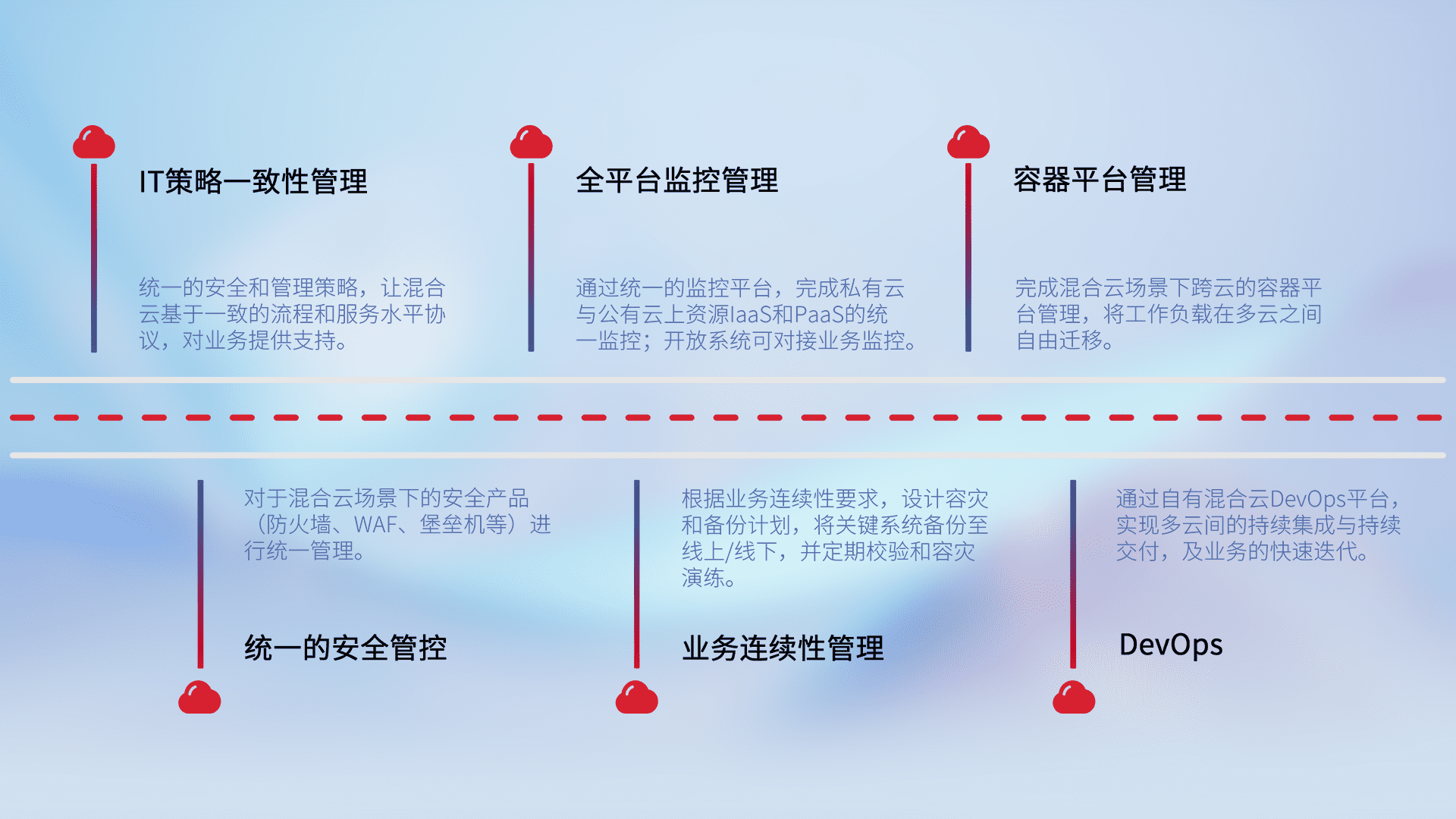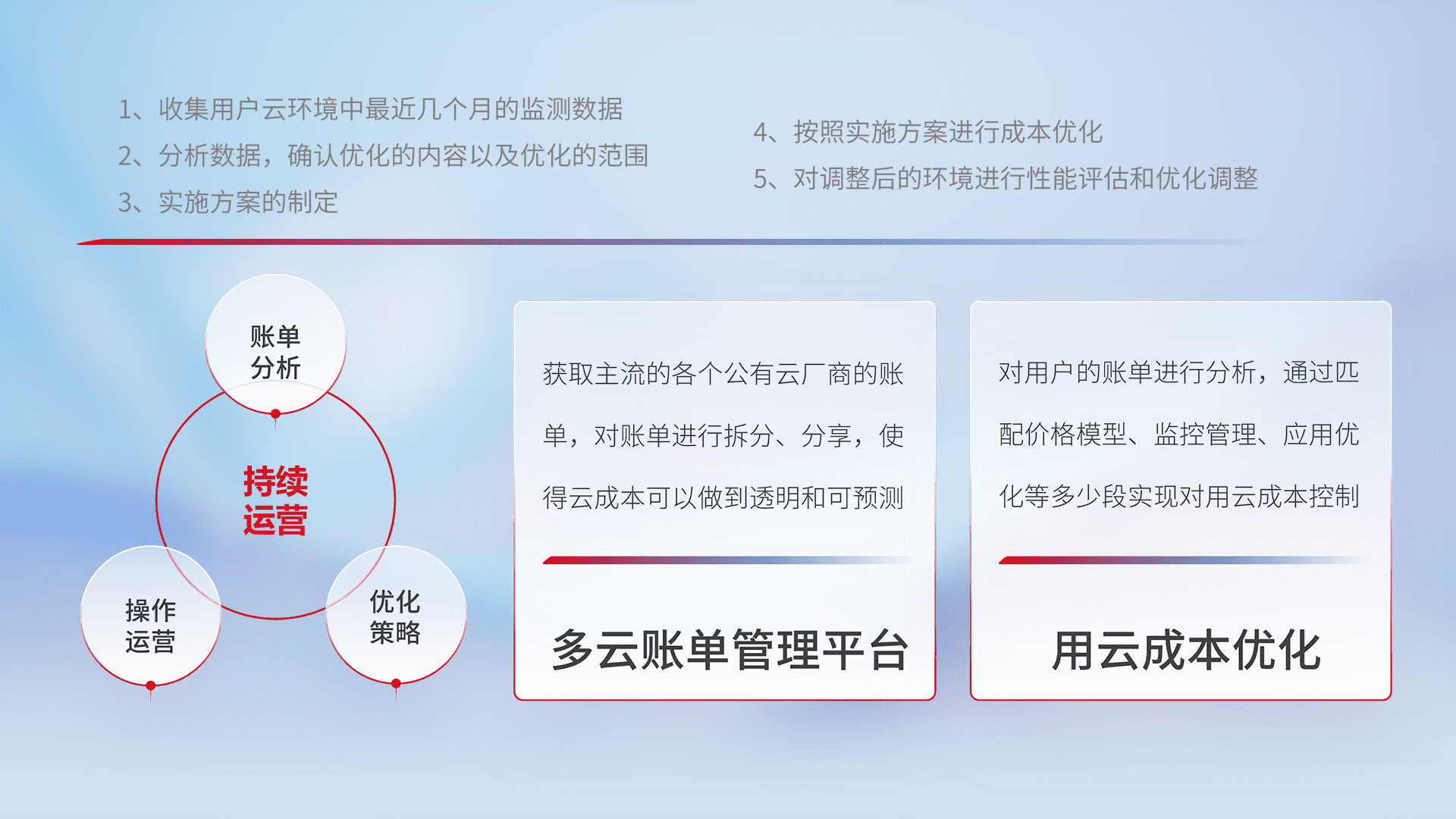 通过多云纳管,,以统一的资源数据模型把客户的云资源进行抽象和封装,,,,进而实现对多云资源的统一操作,,保障云资源管理的可靠性、、、、稳定性与可用性。。。量身定制化运维内容,,,配置、、、、开发运维、、补丁管理、、、、备份、、监控、、认证和访问管理、、审计和日常巡检等,,,保障在用云过程中的可靠度,,,,稳定度以及高可用率。。